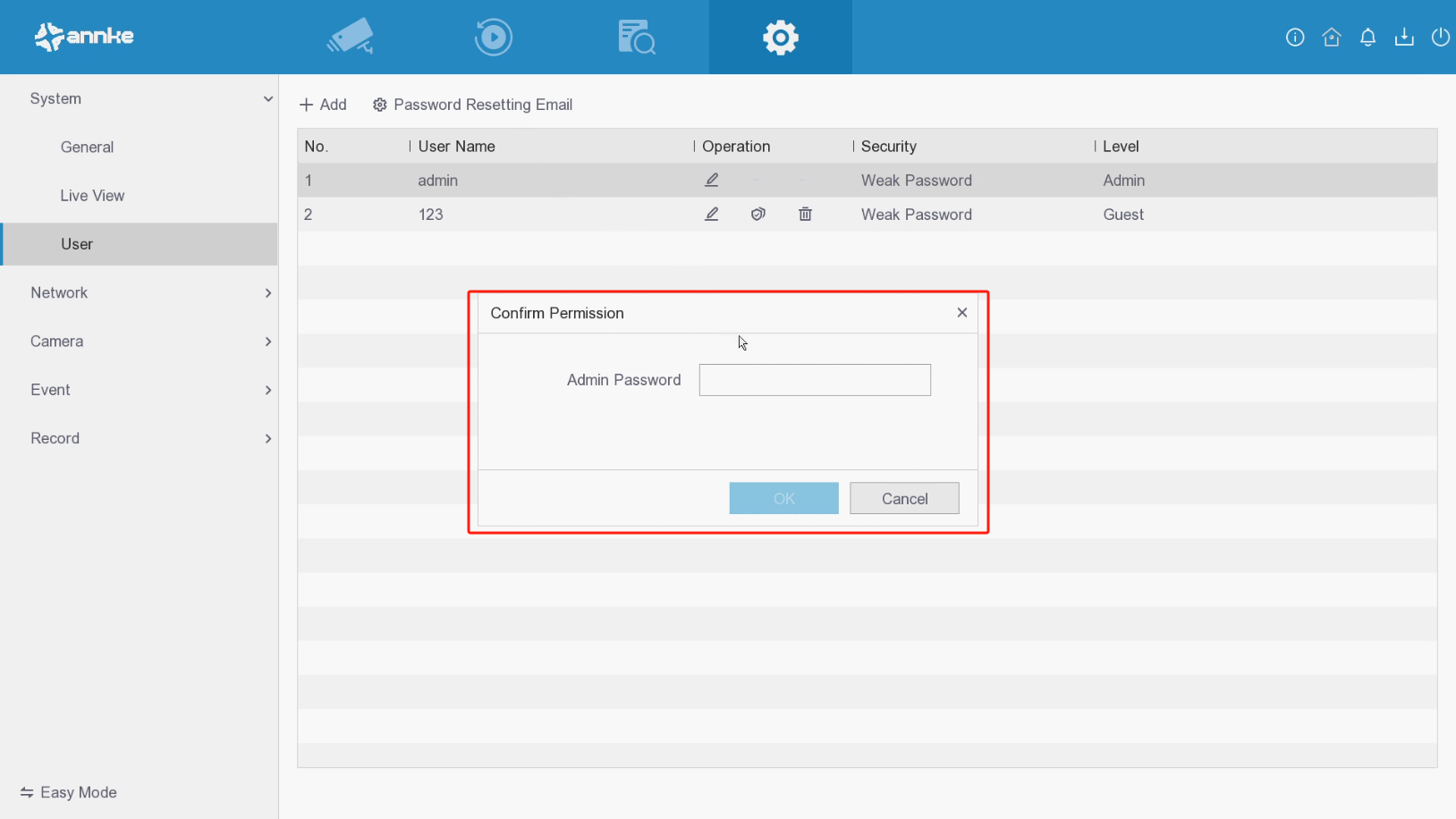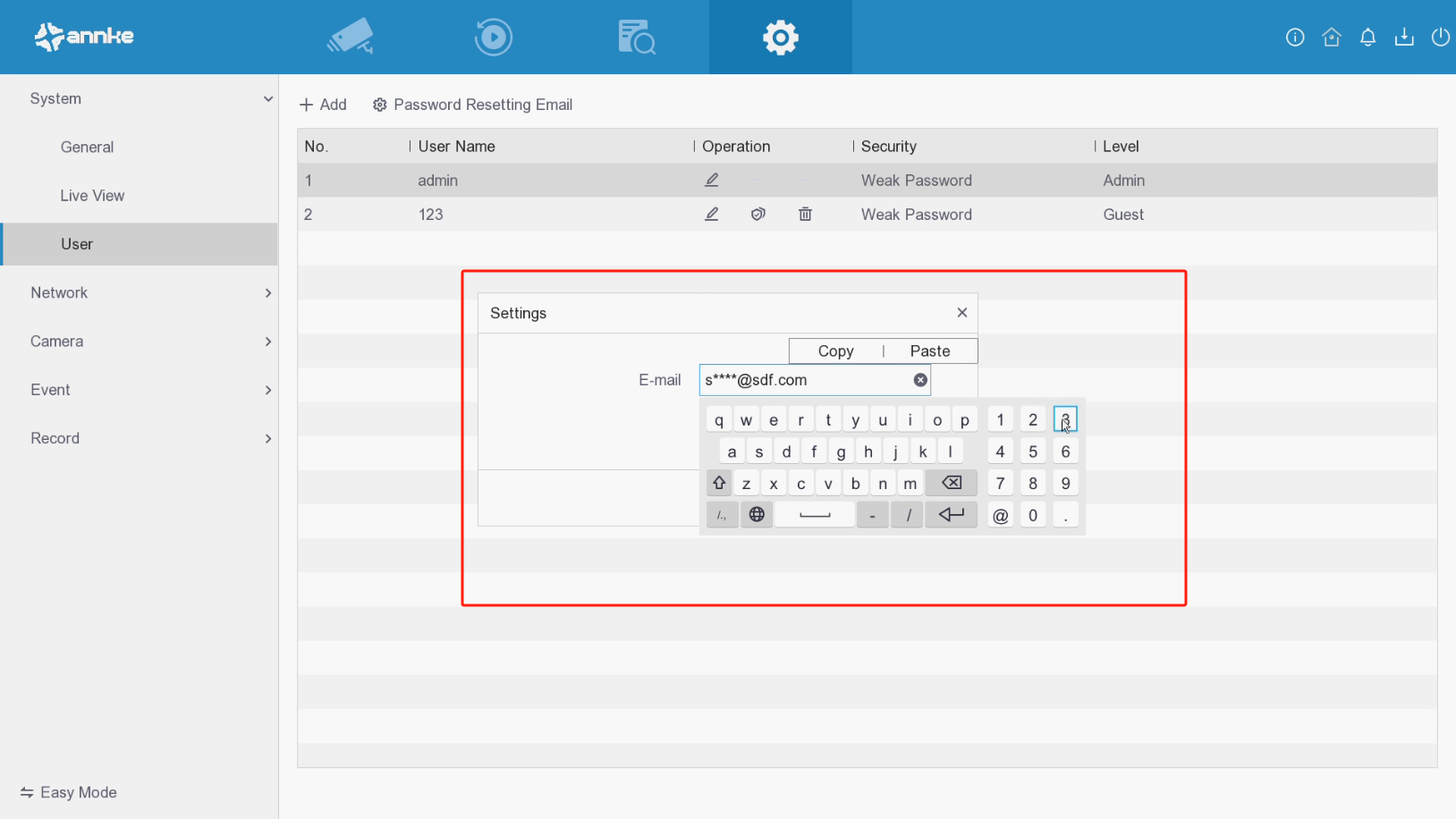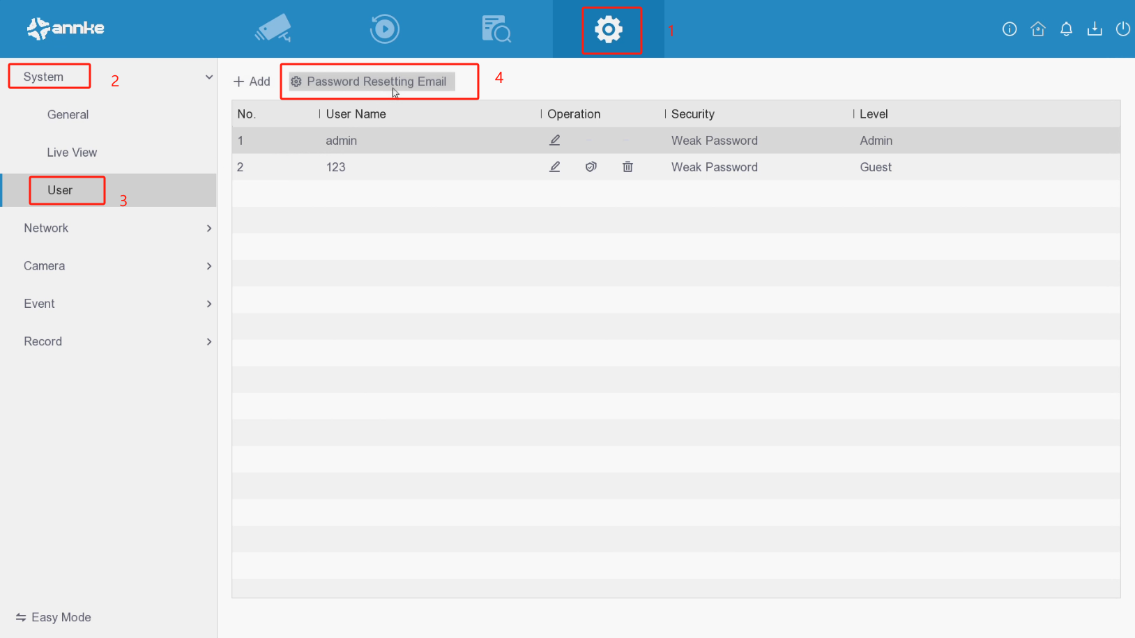 Please right click your mouse to access the menu>configuration>System>User>Password Resetting Email.