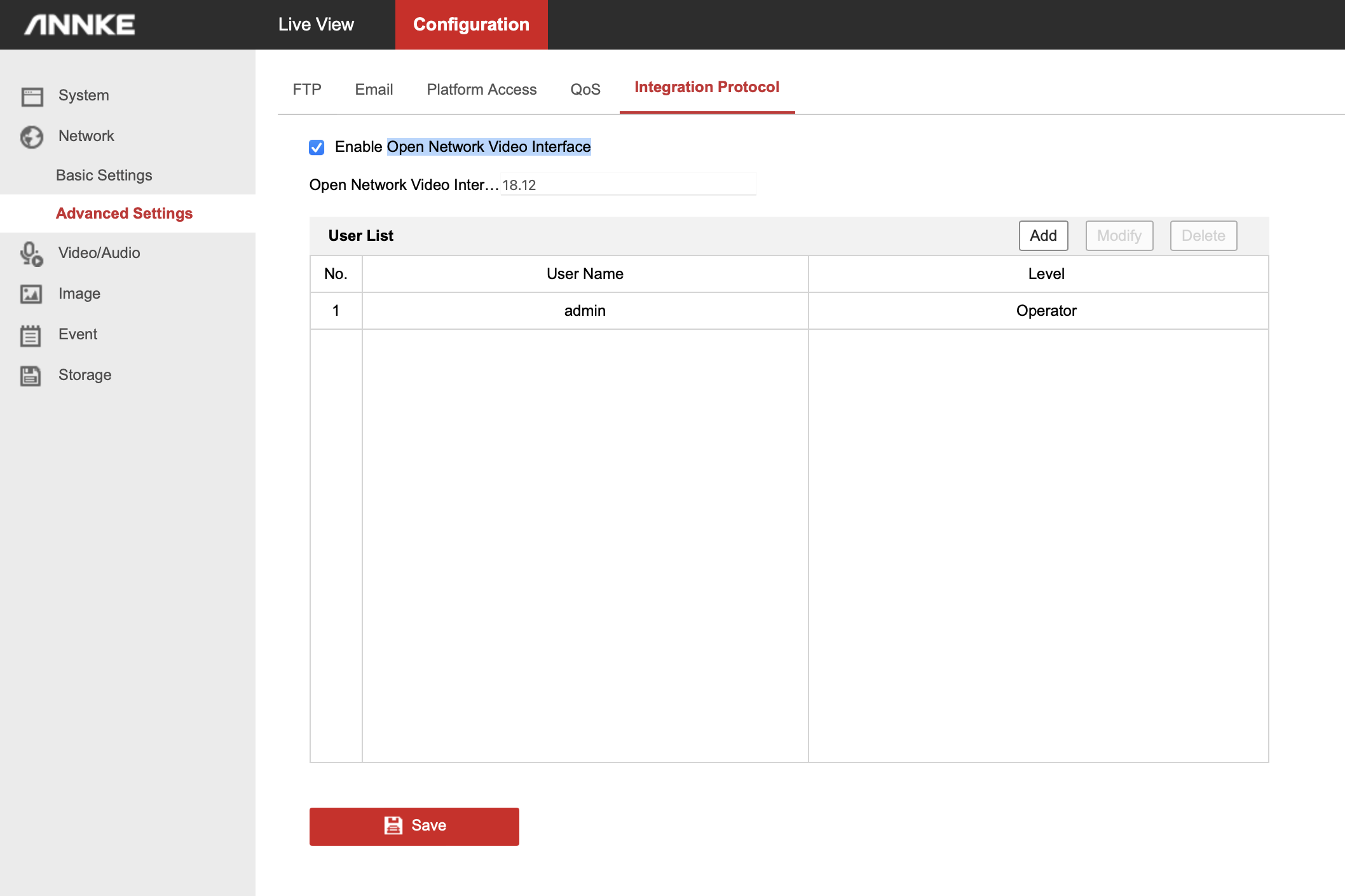 Network: -> Advanced: -> Integration Protocol: -> Enable (ONVIP = Open Network Video Interface Protocol) -> add user & password: -> Save